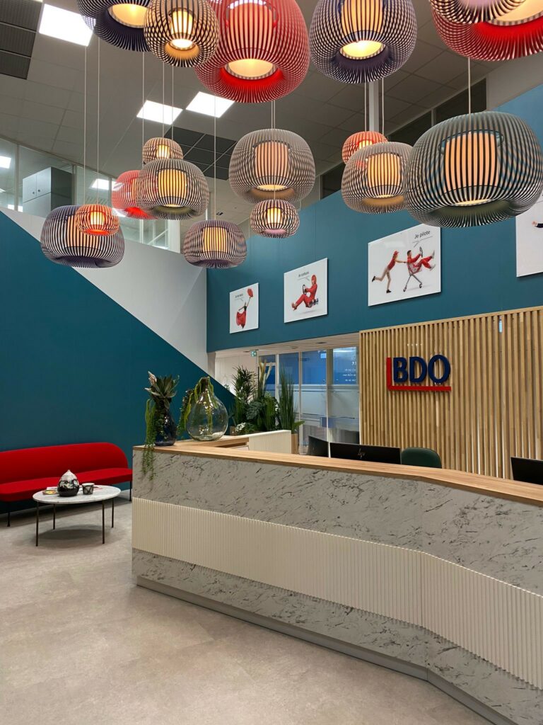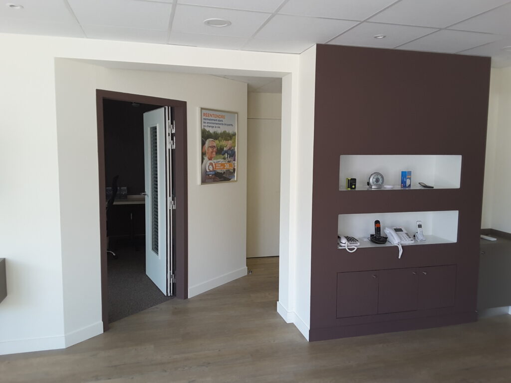 Accueil de l’entreprise Peinture des murs avec baguettes Peinture des murs Pose de toile tendue Toile tendue acoustique sur mur Toile tendue